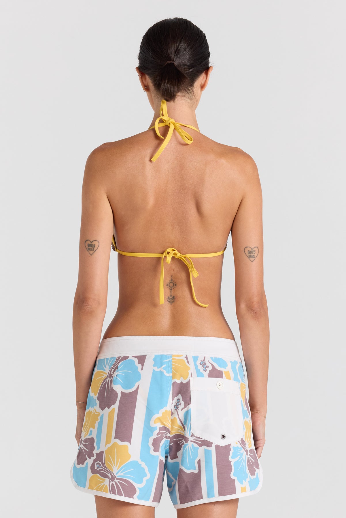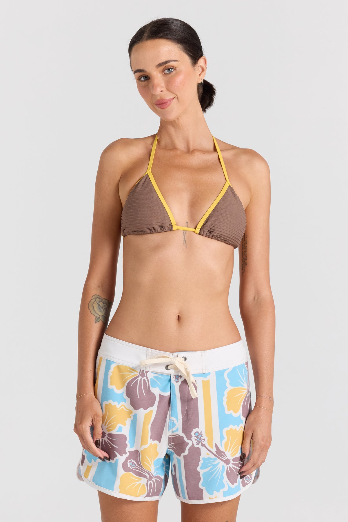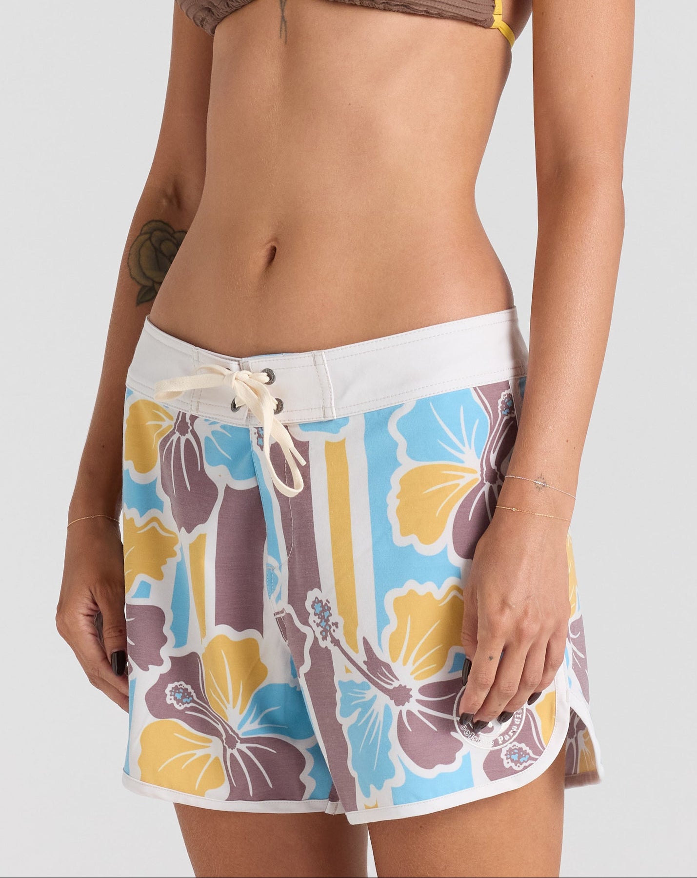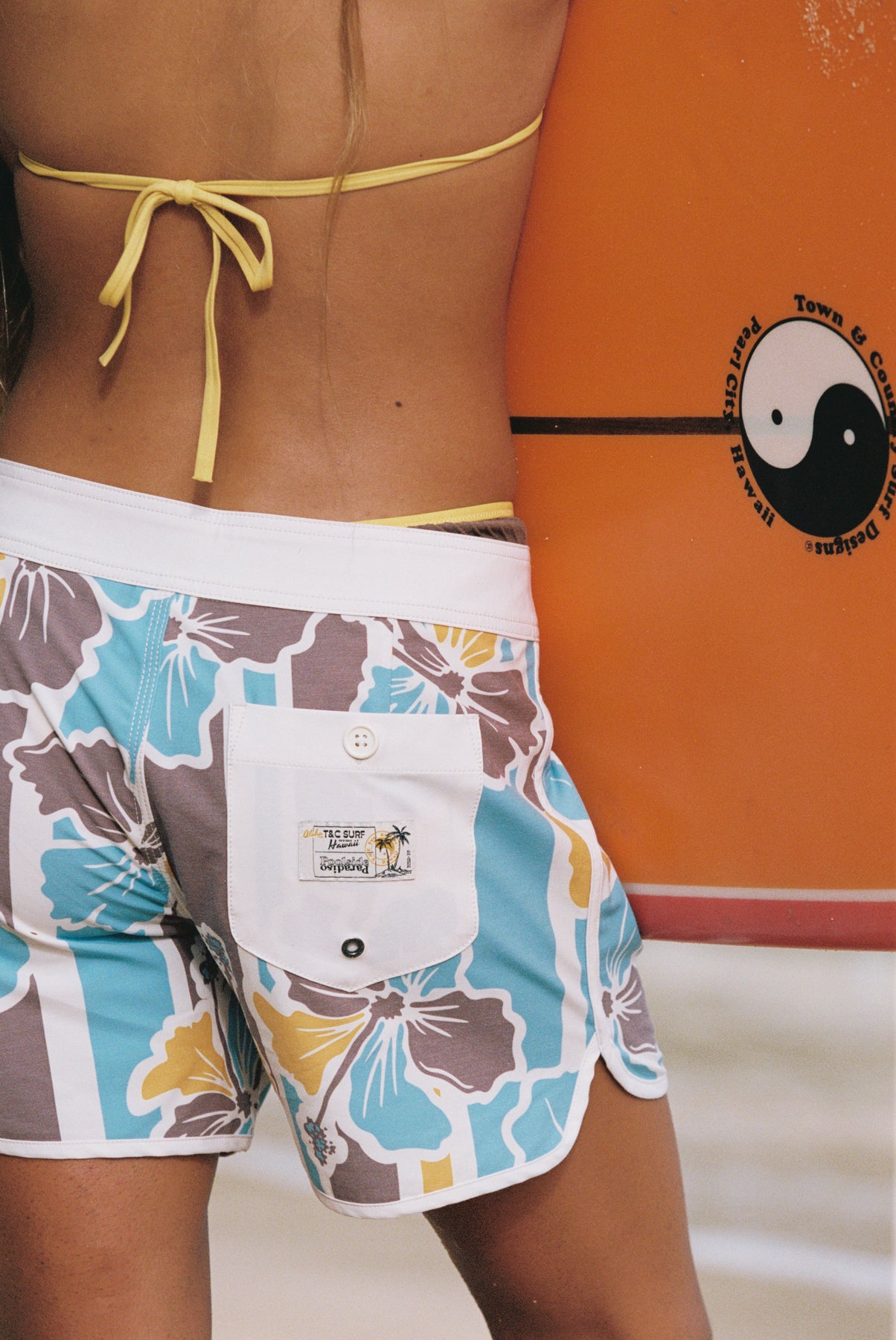 The Northshore Surf Short is a tribute to classic Hawaiian surf culture, reimagined through a modern, feminine lens. Designed in collaboration with Hawaii’s iconic Town & Country Surf, this mid-rise boardshort features a vintage-inspired Hawaiiana print in sun-faded blues, golden yellows, and rich chocolate tones. Crafted for movement and comfort, it features a secure lace-up front, contrast waistband, and practical back pocket—perfect for beach days that turn into sunset sessions. An effortless blend of retro surf heritage and contemporary ease, made for life by the water.