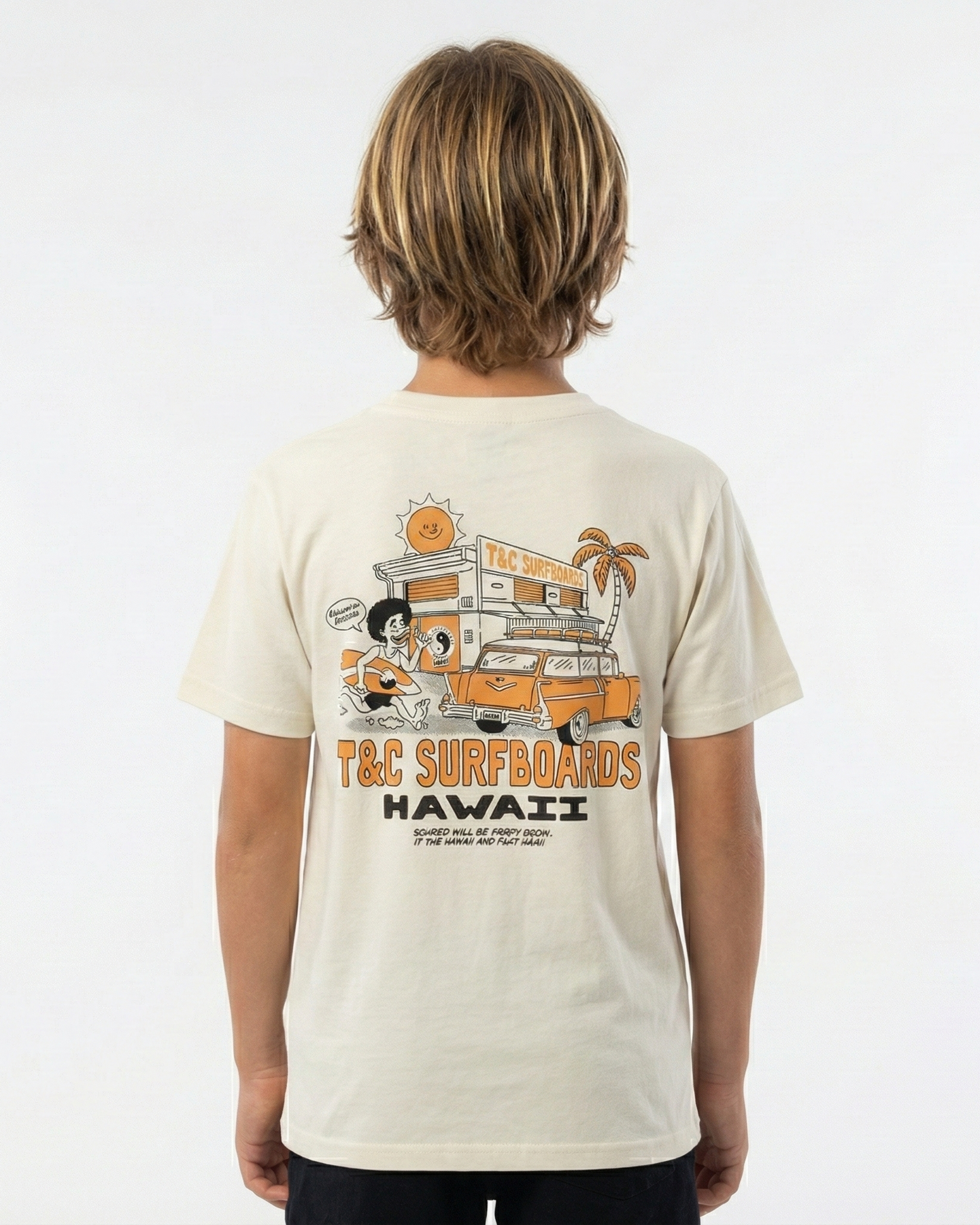 The Gone Surfing Tee taps straight into Town & Country’s roots – a playful callout graphic featuring Larry Bertlemann, the original icon of style and flow. Board under arm, shop closed, gone surfing – it’s surf culture in its purest form, printed on 180 GSM organic cotton for everyday wear.